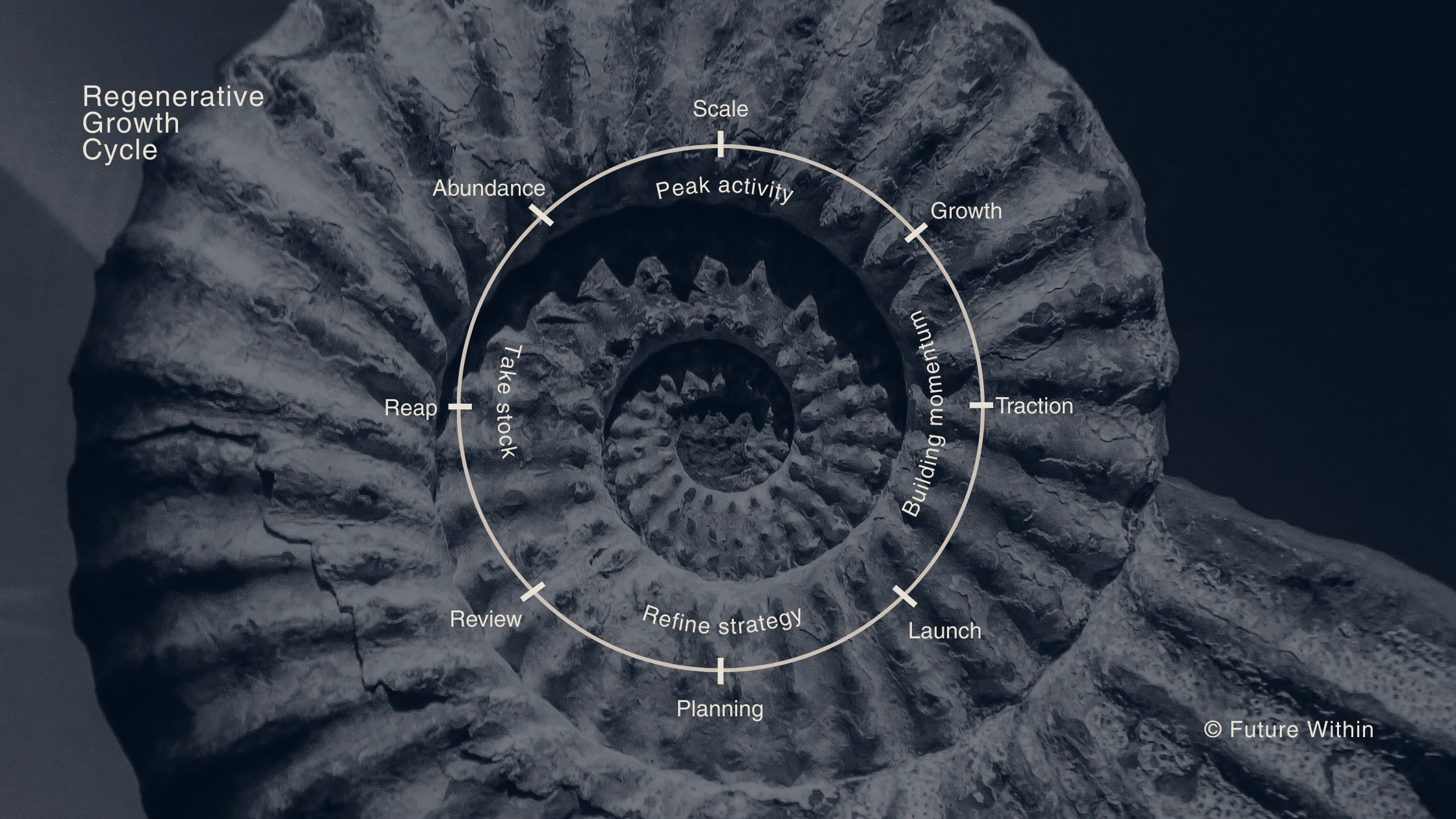 Our Regenerative Growth Cycle has been developed by blending nature’s seasonal cycles with business commercialisation stages and core activities, to develop a cycle that mirrors how nature, and how we as people and leaders, are naturally designed to operate. Another name for this could simply be ‘biomimicry’, or ‘biomimicry for growth’.